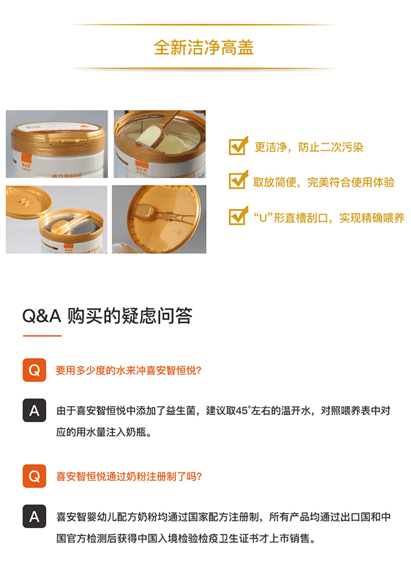 金裝喜安智嬰兒配方奶粉即溶優(yōu)吸收,寶寶少上火,采用創(chuàng)新科技優(yōu)異溶解技術(shù),是奶粉顆粒均勻蓬松,37°常溫水沖調(diào)可迅速徹底溶劑,即沖即飲,使容易變性的熱敏營養(yǎng)物質(zhì)(蛋白質(zhì)、鈣等)的營養(yǎng)損失小化,并大程度避免免疫物質(zhì)的失活,保障營養(yǎng)物質(zhì)的完整性和活性。