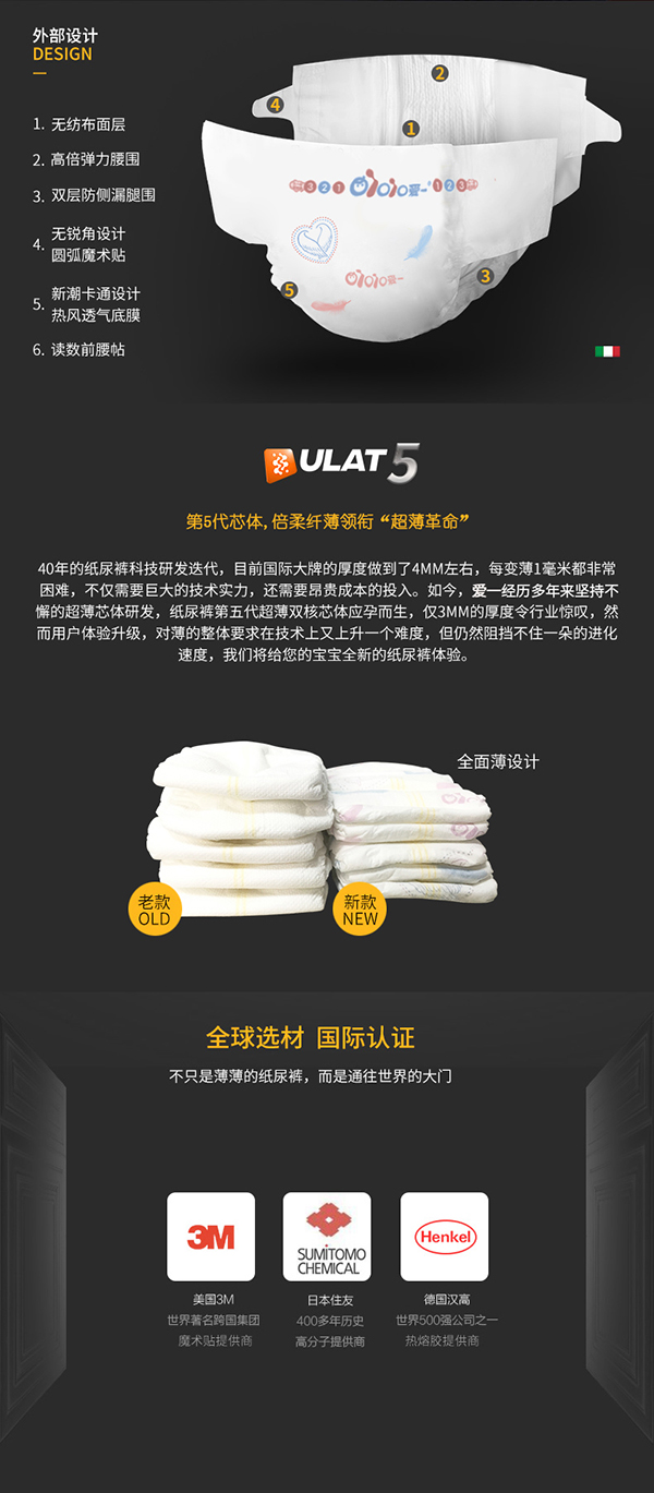 愛一唯愛系列紙尿褲,精選綿柔材料,絲綢般柔軟,猶如云朵般舒適,呵護幼嫩肌膚,媽媽更安心;全芯體設計,纖薄柔軟,高能吸水分子,瞬間吸收,持久鎖濕,不反滲,表層時刻干爽。