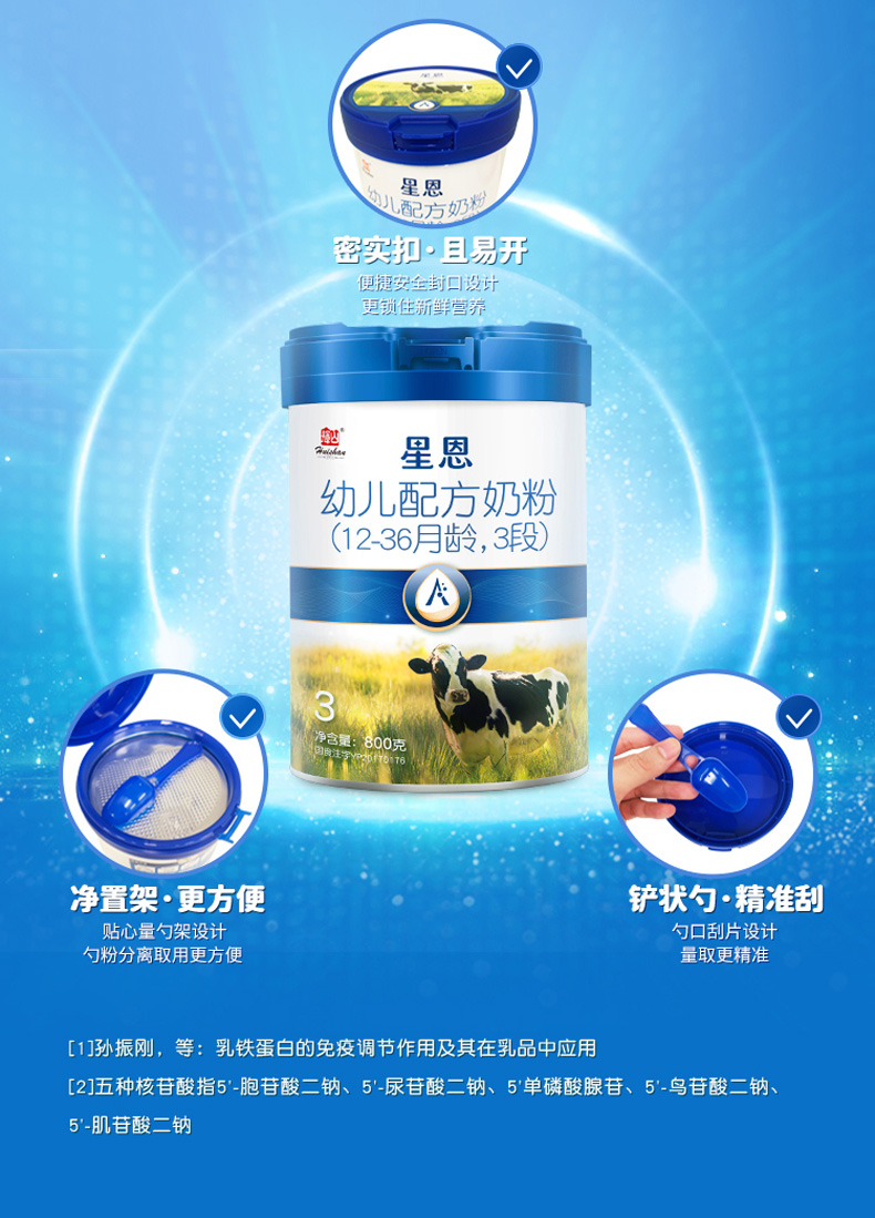 輝山星恩yinge奶粉,精選奶源,源頭把控,工藝鎖留,確保奶粉新鮮品質(zhì)。生牛乳入料,并添加了DHA、ARA、益生元、牛磺酸等,科學(xué)配比,滿足成長(zhǎng)階段的營(yíng)養(yǎng)需求。奶香純正,口感細(xì)膩,易消化,好吸收。