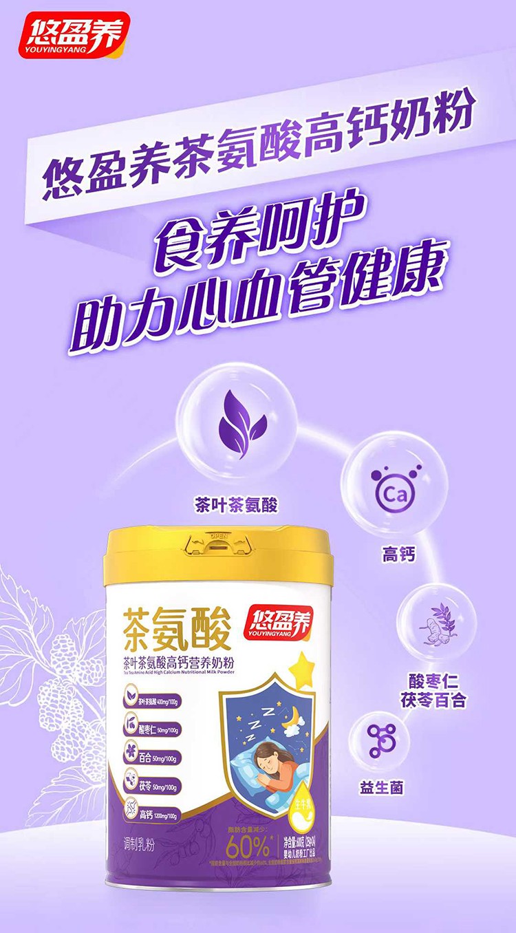 悠盈養(yǎng)茶葉茶氨酸高鈣營養(yǎng)奶粉,根據(jù)中老年健康營養(yǎng)需求精心研發(fā)配方,添加生牛乳,特別添加茶葉茶氨酸、高鈣、酸棗仁、茯苓、百合、益生菌,食養(yǎng)阿護,助力心血管健康。脂肪含量減少60%,只添營養(yǎng)不添負擔。