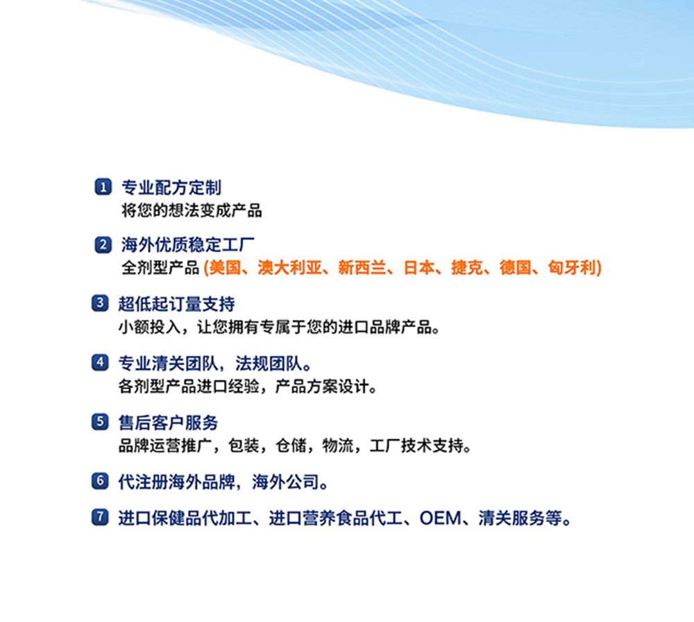 7、進(jìn)口保健品代加工、進(jìn)口營(yíng)養(yǎng)食品代工、OEM、清關(guān)服務(wù)等。
