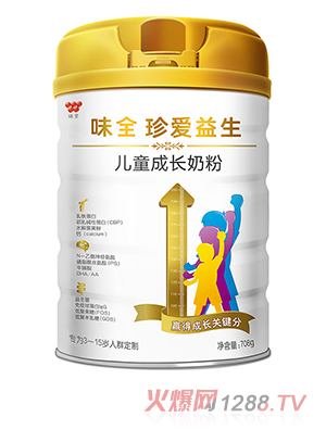 “味全珍愛益生兒童成長奶粉”,添加乳鐵蛋白、初乳堿性蛋白、水解蛋黃粉、鈣1000mg/100克,助力骨骼生長,滿足新一代父母對孩子身高的訴求;添加N-乙酰神經(jīng)氨酸、磷酯酰絲氨酸、牛磺酸、DHA/AA,為大腦提供關(guān)鍵營養(yǎng),智慧成長;添加益生菌、免疫球蛋白IgG、低聚果糖、低聚半乳糖,呵護(hù)消化吸收,增添自身防御能力。